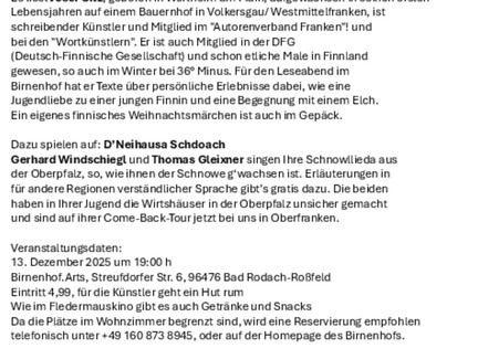 Den Anfang macht am 13. Dezember 2025 ein Wohnzimmerabend. Literatur trifft Musik, unter dem Motto: was haben Westmittelfranken, Finnland und die Oberpfalz gemeinsam und wie verständigen sie sich.