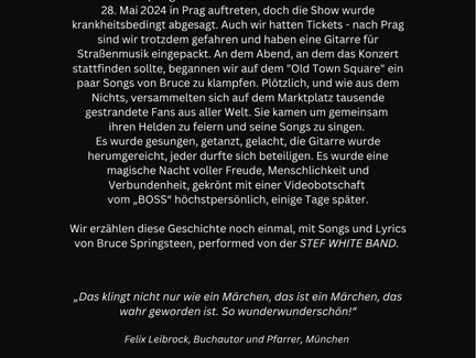 Am 28.Mai 2024 sollten Bruce Springsteen und die E Street Band in Prag auftreten, doch die Show musste krankheitsbedingt abgesagt werden. Die Musikerin Stef White fuhr trotzdem nach Prag und nahm ihre Gitarre für ein bischen Straßenmusik mit. An dem Abend als das Konzert stattfinden sollte, begann sie auf dem Old Town Square ein paar Songs zu spielen, als sich plötzlich, wie aus dem Nichts, tausende gestrandete Fans versammelten und gemeinsam ihrem Idol huldigten. Dies wurde eine Nacht voller Liebe, Freude und Menschlichkeit, die wenige Tage später vom "Boss" durch eine Videobotschaft gekrönt wurde. Die Stef White Band erzählt diese Geschichte nochmal, mit Songs und Lyrics von Bruce Springsteen, präsentiert vom Moderator Holger Behr.